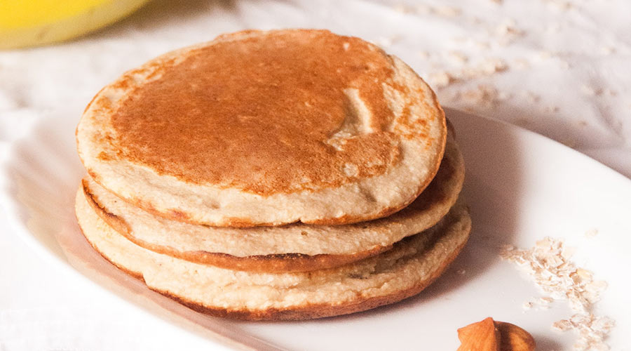 Die Speisestärke wird mit 2 Esslöffeln Apfelsaft glattgerührt. Der restliche Saft wird mit dem Ahornsirup aufgekocht. Die Stärkemischung wird hinzugegeben und das Ganze 2 Minuten köcheln gelassen. Die Heidelbeeren werden hinzugefügt und das Ganze weitere 5 Minuten köcheln gelassen. Die entstandene Grütze wird offenstehen gelassen bis er abgekühlt ist. Mischung 1: Die Banane wird geschält und mit einer Gabel zerquetscht. Mischung 2: Das Mehl und das Backpulver wird mit dem Zimt versmischt. Mischung 3: Die Eier und die Milch werden mit 4 Esslöffeln Öl verquirlt. Alle drei Mischungen werden zu einem Teig verrührt. 2 Esslöffel Öl werden in einer Pfanne erhitzt. Die Pfannkuchen (insgesamt zirka 12) werden darin rund 4 Minuten lang goldbraun gebacken. Zwischendurch werden sie mindestens einmal gewendet. Die fertigen Pfannkuchen werden mit Heidelbeergrütze und Quark serviert.