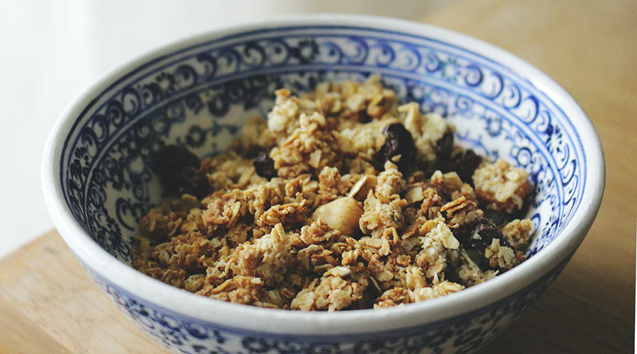 Die Pekannüsse und Walnüsse werden grob gehackt. Danach werden sie mit Haferflocken, Kokoschips, Kürbiskernen, Leinsamen, Sesam und Sonnenblumenkernen gemischt. Die Banane wird geschält und in Stücke geschnitten. Das Kokosöl wird in einem Topf geschmolzen und mit Banane, Zimt und Salz zu einem Püree verarbeitet. Die Haferflocken-Mischung wird mit dem Bananenpüree vermischt. Die so entstandene Masse wird gleichmäßig auf einem Backblech verteilt. Danach wird sie für zirka eine halbe Stunde bei 175 °C (Ober- / Unterhitze) gebacken, bis das Ganze eine goldbraune Farbe angenommen hat. Während dieser Zeit wird die Masse mehrmals durchmischt, damit alles gleichmäßig bäckt. Das fertige Knuspermüsli wird auf dem Backblech so lange offenstehen gelassen, bis es vollständig ausgekühlt ist. In luftdicht verschlossenen Behältern hält sich das Müsli mindestens 14 Tage lang.