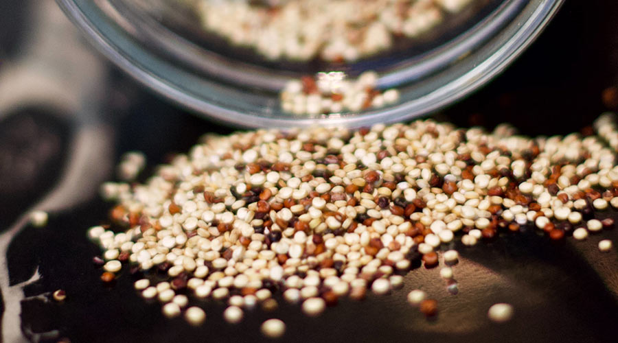 Den Quinoa in einem Sieb mit warmem Wasser abspülen. Den Quinoa mit der Mandelmilch in einem Topf unter Rühren aufkochen. Danach wird das Ganze auf kleinster Stufe für zirka 15 Minuten köcheln gelassen, bis ein Großteil der Flüssigkeit aufgesogen wurde. Die Bananen werden geschält und in kleine Stücke geschnitten. Die Weintrauben werden gewaschen und halbiert. Danach werden die Hälfte der Trauben und Bananen unter den Brei gerührt und das Ganze ungefähr 5 Minuten lang quellen gelassen. Die Mandeln werden grob gehackt. Zimt und Honig werden unter den Brei gerührt. Der Brei wird in eine Schüssel gegeben und mit Mandeln sowie den restlichen Bananen und Trauben bestreut.